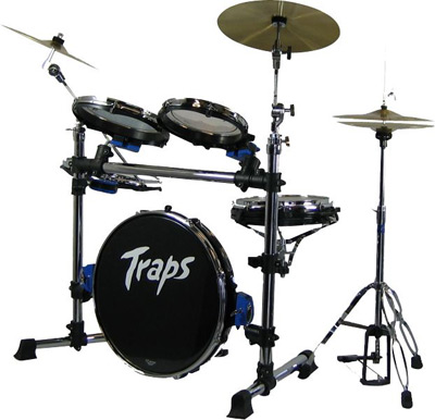 Portability takes a front seat with tradition riding shotgun in this slightly unorthodox kit from Traps Drums. These drums don’t even have shells! Instead the bearing edge is an integral part of an ABS-molded “hoop” that also incorporates the “lugs”. The 20″ Bass drum is dual headed, as is the 12″ snare, while the 10″, 12″ and 14″ Toms are single headed. The shell pack, including Hi hat stand, bass pedal and the rack for mounting it all to, has a MSRP of US$995 and street price is roughly US$600.