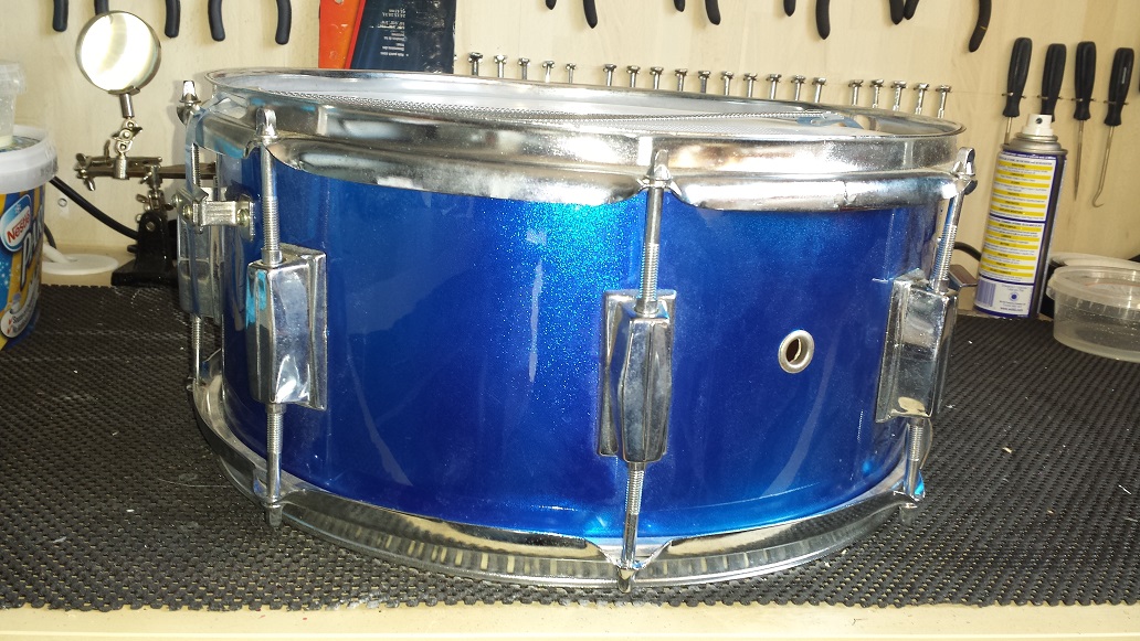 A bit more wet sanding and polishing would have been advisable for a perfect finish. I guess impatience got the better of me. In any case it turned out good and this clever little DIY Sparkle Finish Snare Drum is already learning tricks. Going to the potty and brushing his lugs all by himself. He also loves to gaze out the window.