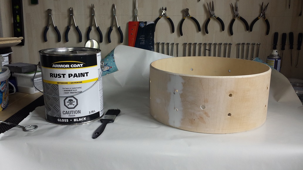 The victim selected for this project is a generic snare drum from our collection of odds and ends. It’s a standard 14″ X 5.5″ with a thin 4-ply shell. The bearing edges are a disaster so we son’t bother masking them. If your intention is to keep your bearing edges intact you will need to mask them.
